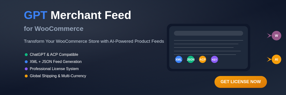 Potencia tus ventas con feeds inteligentes diseñados específicamente para ChatGPT, Google ACP (Advanced Commerce Platform) y las principales plataformas de comercio electrónico. Convierte tu catálogo de WooCommerce en feeds XML y JSON optimizados que aumentan la visibilidad, mejoran las conversiones y automatizan la gestión de productos.